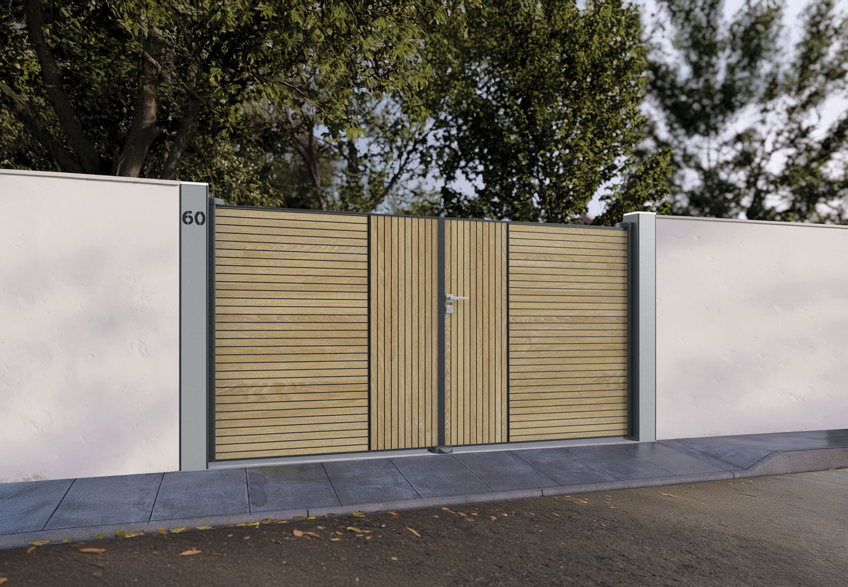 En option, vous pouvez choisir deux faces différentes pour l’intérieur et l’extérieur de votre portail, optez pour une face Urban et une face Klostra, ou bien deux designs différents de la même collection.